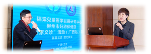 会议由柳州市妇幼保健院陈继昌副院长主持。柳州市妇幼保健院林忠书记首先致辞。林书记介绍了柳州市妇幼保健院医联体建设的相关情况并表示将一如既往支持福棠中心各项工作。随后,三江县卫健局吴海波局长、福棠儿童医学发展中心马庚副主任分别致辞。吴局长代表三江县卫健局,感谢福棠中心为提升基层医院及贫困地区医疗水平所作出的贡献。三江县作为国家级深度贫困县,贫困人口基数大,医疗卫生水平有限,在柳州市妇幼保健院的技术帮扶下,有效解决了当地群众看病难、看病贵的问题。马庚副主任代表中心,对此次会议各方组织工作表示感谢,并说明了会议在三江举办的重要意义。随着各理事成员医院医联体建设工作的逐布深入,中心工作也从省级层面深入到基层,特别是贫困地区。基层医疗水平的提升、健康扶贫工作的开展,也是中心2019年工作的重点。通过精准健康扶贫、青年专家义诊等活动,推进基层及贫困地区医疗卫生事业发展。随后青年专家义诊活动(广西站)正式启动,至此拉开了2019年度青年专家义诊的帷幕。
